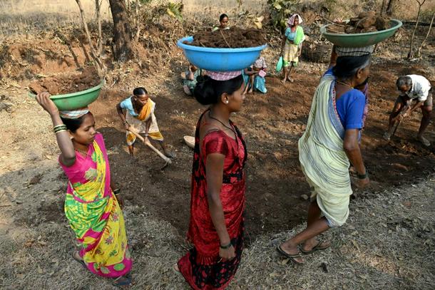 Wage-labourers under Mahatma Gandhi National Rural Employment Guarantee Act work at a road-construction site at Balapur Dolkarpada village in Maharashtra's Palghar district