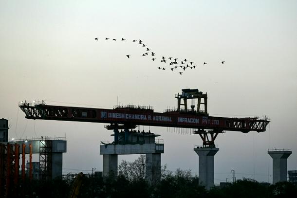 A flock of birds flies over a section of the high-speed Ahmedabad-Mumbai rail project across the Sabarmati river in Ahmedabad