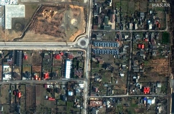 One of the satellite images released by Maxar Technologies on in 2022 which helped rebut Russian assertions that dead bodies in civilian clothing found in Bucha had appeared there after Russian forces retreated from the devastated Ukrainian town