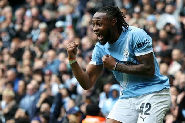 Antoine Semenyo celebrates scoring for Manchester City in a FA Cup quarter-final triumph over Liverpool.
