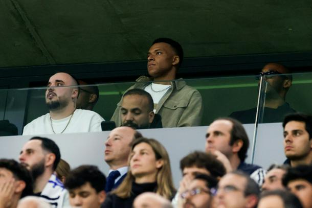 Kylian Mbappe (C) watched Real Madrid beat Manchester City in the first leg of the Champions League last 16 but he should be fit for the second leg on Tuesday