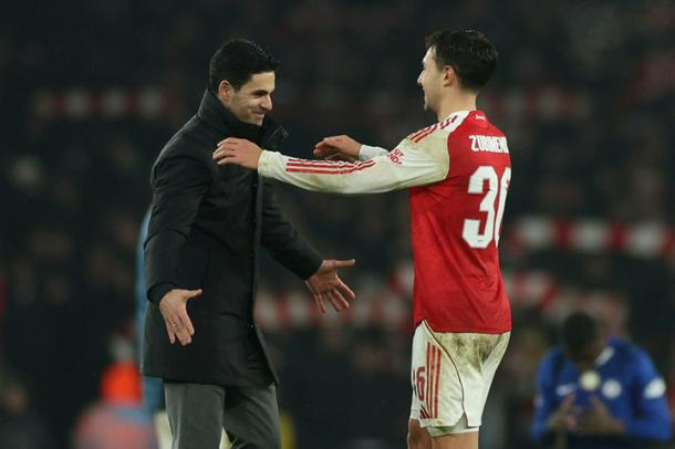 Arsenal manager Mikel Arteta embraces Martin Zubimendi after the League Cup semi-final