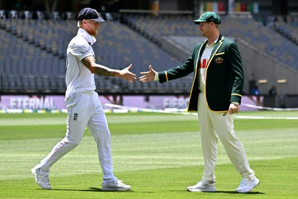 Australia captain Steve Smith (R) shakes hands with England captain Ben Stokes at Perth Stadium