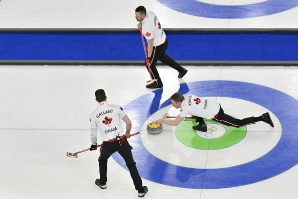Canada's Marc Kennedy (C), Brett Gallant and Ben Hebert compete in the curling men's round robin against Switzerland