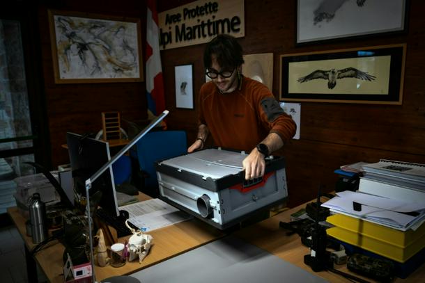 Doctoral student Marco Granata checks a camera trap used to monitor small mustelids, such as ermines, in the Maritime Alps.