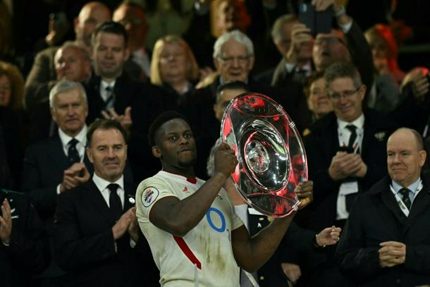 England captain Maro Itoje lifts the Hillary Shield after his side's 33-19 win over New Zealand at Twickenham