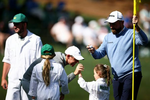 Defending champion Rory McIlroy, the world number two from Northern Ireland, celebrates with his daughter Poppy on the ninth green at the Masters Par-Three Contest