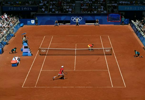 Novak Djokovic (L) watched Carlos Alcaraz attempt a volley in the Paris 2024 Olympic men's single final
