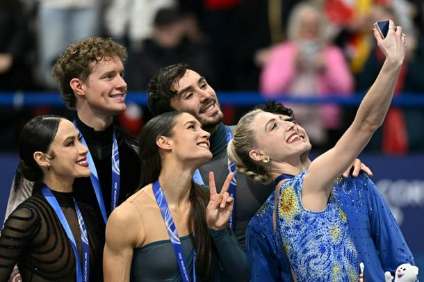 French gold medallists France's Laurence Fournier Beaudry and Guillaume Cizeron (centre) with US silver medallists Madison Chock and Evan Bates (L) and third-place Piper Gilles and Paul Poirier of Canada