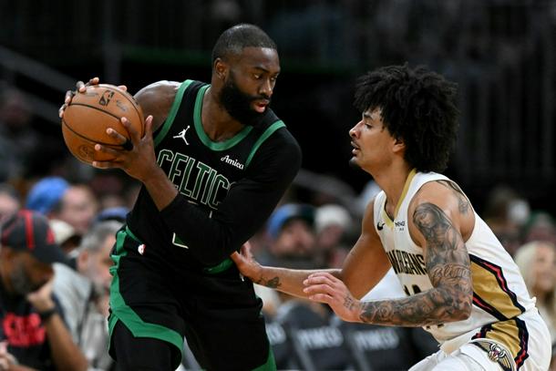 Boston Celtics star Jaylen Brown drives to the basket against Micah Peavy in the Celtics' NBA win over the New Orleans Pelicans
