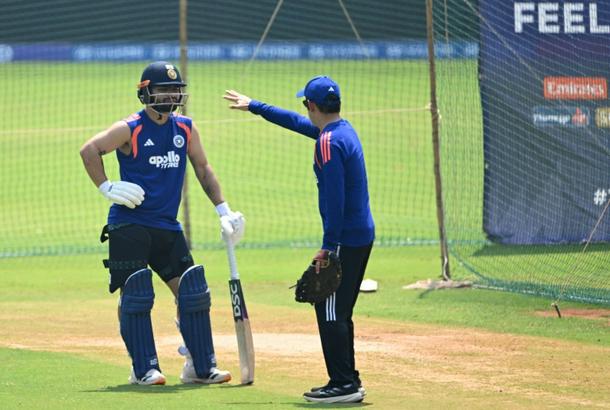 India's Rinku Singh (left) listens to coach Gautam Gambhir (right) during training in Mumbai on Wednesday ahead of the T20 World Cup semi-final with England