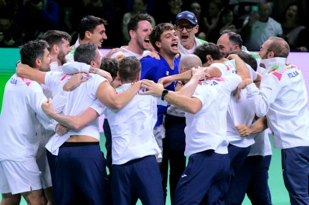 Flavio Cobolli (C) is mobbed by his team-mates after sealing another Davis Cup triumph for Italy
