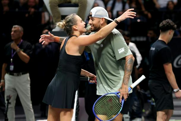 Aryna Sabalenka and Nick Kyrgios embrace at the net after the 'Battle of the Sexes' in Dubai