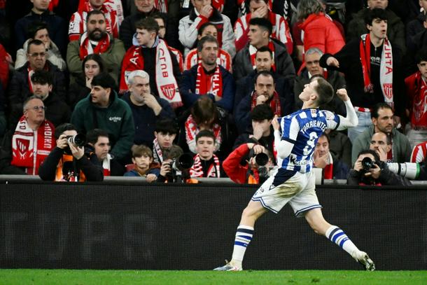 Real Sociedad's Spanish midfielder Benat Turrientes celebrates scoring the opening goal at Athletic Bilbao on Wednesday in the Copa del Rey semi-final first leg derby clash
