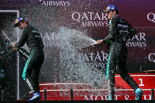 Mercedes' British driver George Russell (R) celebrates with teammate Kimi Antonelli (L) in Melbourne