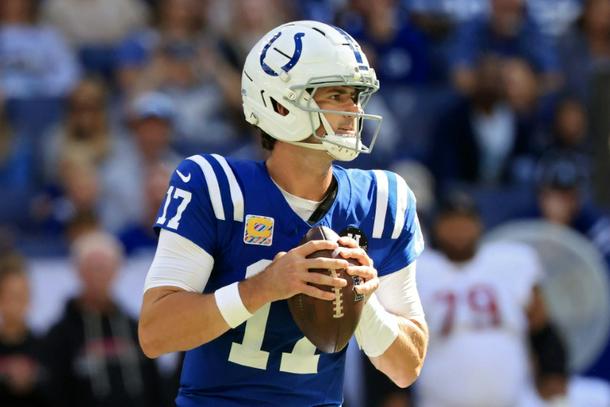 Indianapolis Colts quarterback Daniel Jones looks to pass in an NFL game against the Arizona Cardinals