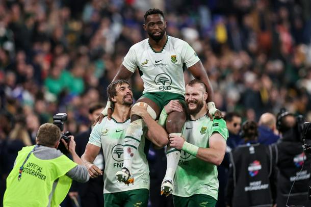 South Africa captain Siya Kolisi, here being hoisted in the air by locks Eben Etzebeth (L) and RG Snyman (R), said the Springboks 'cannot be arrogant' against Wales