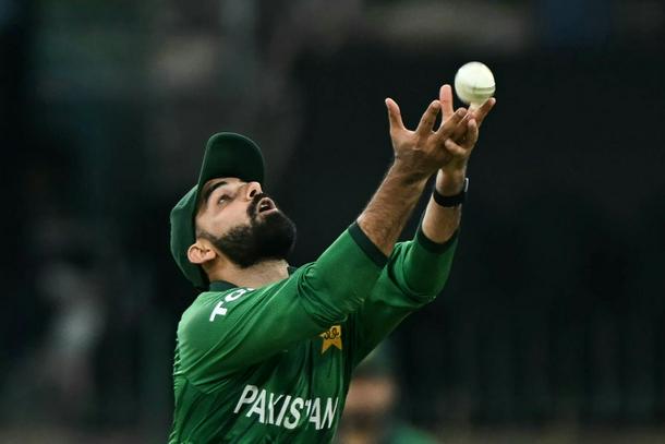 Pakistan's Shadab Khan takes a catch to dismiss Namibia's JJ Smit