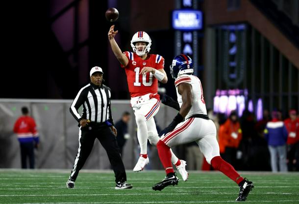 New England quarterback Drake Maye makes a pass under pressure in the Patriots' defeat of the New York Giants
