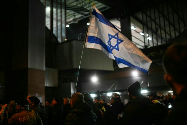 A few dozen pro-Israel protesters stood at the other side of the stadium, waving Israeli flags and holding posters that read “Keep anti-Semitism out of football”, before being escorted away by police.