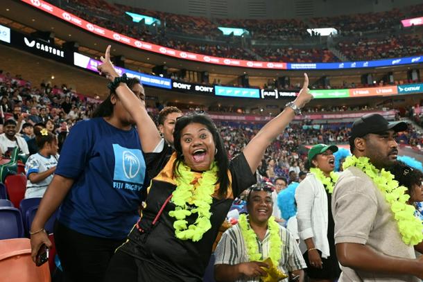 Fiji fans cheer their team at the Kai Tak sports stadium