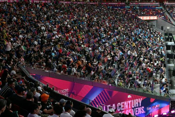 Crowds watch Australia against Britain play on the first day of the 2026 Rugby Sevens Hong Kong tournament at the Kai Tak sports stadium
