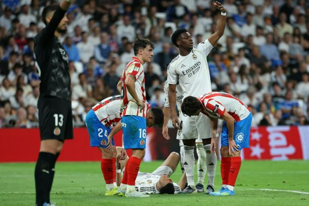 Real Madrid striker Kylian Mbappe was left with blood on his face after he collided with Girona defender Vitor Reis's arm