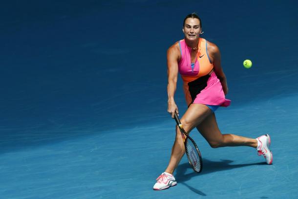 Aryna Sabalenka hits a return against China's Bai Zhuoxuan