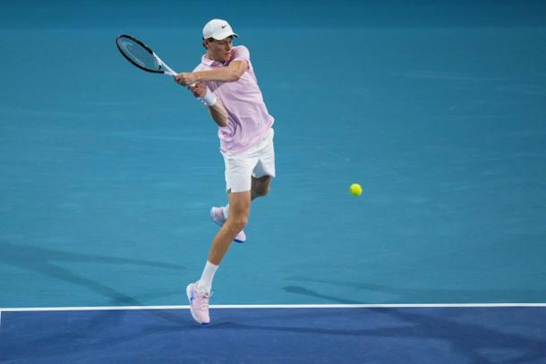 Jannik Sinner blasts a backhand against Corentin Moutet in his victory at the Miami Open