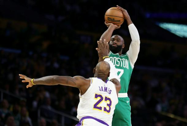 Boston's Jaylen Brown attempts a shot against LeBron James in the Celtics' NBA victory over the Los Angeles Lakers