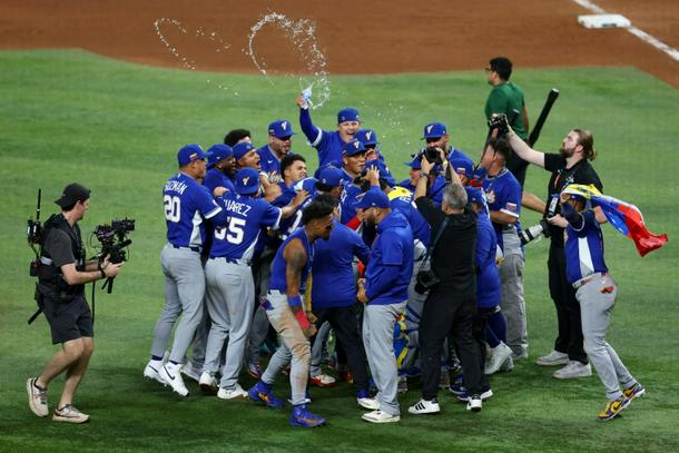 Venezuela celebrate after their World Baseball Classic victory over the United States