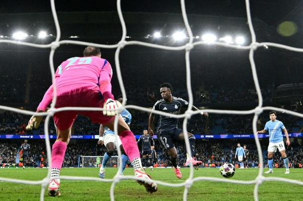 Vinicius Junior (C) puts his second goal past Manchester City goalkeeper Gianluigi Donnarumma in Tuesday's 2-1 win at the Etihad