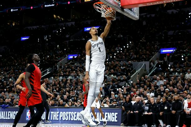 San Antonio Spurs star Victor Wembanyama delivers a dunk in the Spurs' series-clinching victory over the Portland Trail Blazers in the first round of the NBA playoffs