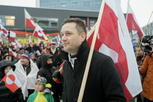 Greenland's leader Jens-Frederik Nielsen holds a Greenlandic flag as he attends a demonstration to the US consulate in Nuuk, Greenland over the weekend, as Greenlanders admit they cannot fight the United States but have no wish to be part of it